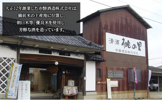 赤磐酒造株式会社…大正12年創業。備前米の主産地に位置し、朝日米等、優良米を使用し、芳醇な酒を造っています。篤農家の人々が夏は米作り、冬は酒造りに加わっています。また経営者自らも酒造りに加わり、蔵人全員精進を重ね、一期一会の良質な酒造りに励んでいます。