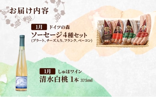 7. 定期便 2026年 先行予約 ドイツの森の人気商品と是里ワイナリーのワイン 欲張り 2回コース ソーセージ 加工品 ワイン ピオーネ 清水白桃