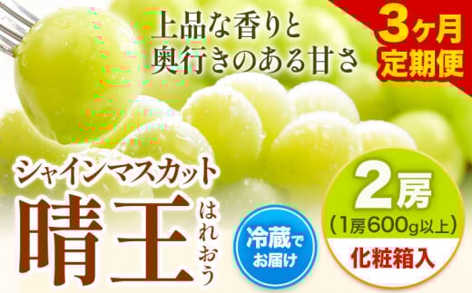 【2026年先行予約】【3ヶ月定期便】 シャインマスカット晴王 はれおう 2房入り(1房600g以上) 化粧箱入 株式会社山博(中本青果)《2026年8月下旬から10月下旬出荷》 定期 計3回お届け 岡山県 浅口市 ぶどう マスカット 大粒 フルーツ 秀品 旬 果物 贈り物 ギフト 送料無料【配送不可地域あり】