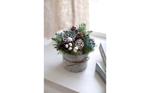 クリスマスを彩るのにぴったりなカラーの「コロンウィンター」。ふかふかな羊毛フェルトでガラスの花器を優しく包んだ、手のひらサイズのほっこり心温まるフラワーアレンジメント。