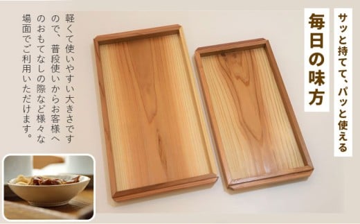 徳島県産杉を使った木製トレー。木の素材感や色合いが、温もりと落ち着きを与えます。