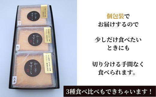 厳選素材でつくった、大きめサイズのご褒美かすてら。3つの味のセット/ギフト