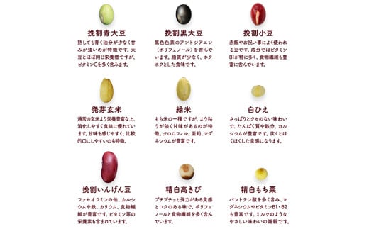 裸麦α(大麦(国産))、黒米、裸押し麦、もち麦、赤米、黄大豆(割り)、黒千石大豆、青大豆(割り)、黒大豆(割り)、青肌玄米、小豆(割り)、発芽玄米、緑米、米粒状こんにゃく加工食品、精白ひえ、インゲン豆(割り)、精白もち栗、精白もちきび、精白はと麦、精白うるち栗、うずら豆(割り)、発芽もち玄米/加工デンプン、グルコン酸Ca、増粘剤(アルギン酸Na)、調味料(有機酸)