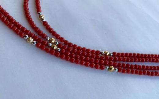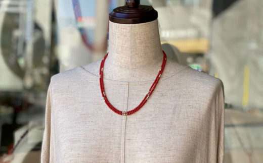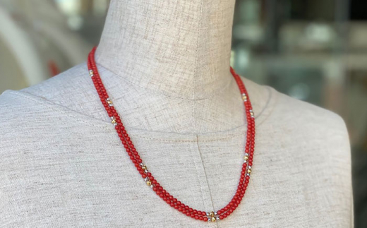 デザイン性の赤珊瑚2連ネックレス.ミラーボールがポイントに
