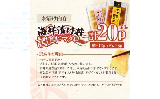 訳あり海鮮漬け丼(タイ12P・マグロ8P)セット 漬け丼 漬け 鯛 鮪 マグロ 赤身 食べ比べ 海鮮 魚 冷凍 食品 保存食 小分け 高知 土佐 海鮮丼 漬け丼 ぶっかけ お茶漬け 鯛めし 惣菜 そうざい 訳アリ わけあり 不揃い 規格外 故郷納税 返礼品