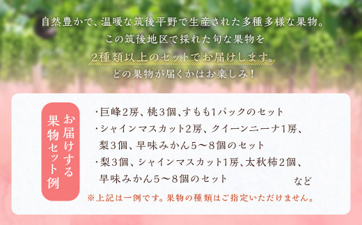 筑後地区で採れた旬な果物をセットでお届けします。 どの果物が届くかはお楽しみ!