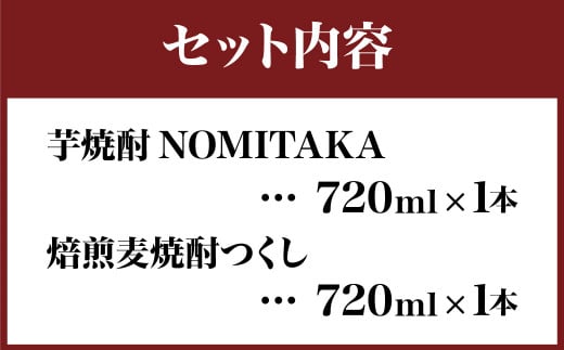 「芋焼酎NOMITAKA」と「麦焼酎焙煎つくし」の2本セットです。