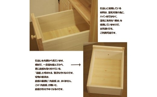 引出しには湿気対策バッチリの桐材を採用。台所周りでも安心してご使用できます。