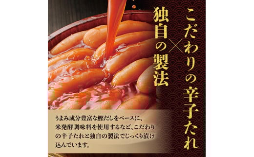 すけとうだらの卵巣(ロシア又は米国)、食塩、アミノ酸液、砂糖混合ぶどう糖加糖液糖、発酵調味料、還元水飴、唐辛子、蛋白加水分解物、かつおエキス添加物:調味料(アミノ酸等)、酸化防止剤(V.C)、ナイアシン、甘味料(ステビア、甘草)、発色剤(亜硝酸Na)、酵素、(一部に大豆、小麦、豚を含む)