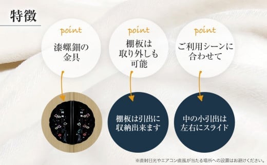 製品名、Cute(キュート)。小ぶりな、桐タンス(桐たんす・桐箪笥)。展示会に出すと、民芸調でもなく、モダン調でもなく、なんとなく「可愛い~」と言われるのが特徴といえば特徴。とあるところに納品に行きましたが、お客さまはベタボメ。やはり全体的に雰囲気が可愛い~ということ。特に金具が購入の決め手となったということでしたが、漆地に螺鈿で梅柄は、いままでにない金具なんです。