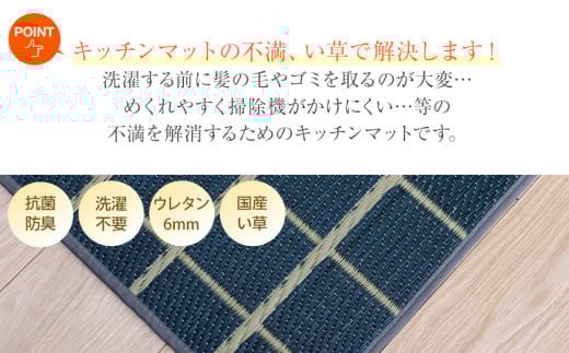 い草のキッチンマットです。キッチンマットの不満を解消してくれる商品です。化繊もののキッチンマットと比べ、汚れにくくシミになりにくいです。小さなゴミでも、ほうきで掃く、掃除機をかけるだけで取り除くことができます。い草自体が持つ油分により汚れを弾くので洗う必要がなく長くご使用いただけます。裏地にはウレタンフォームを使用しクッション性を持たせています。