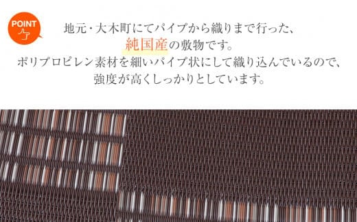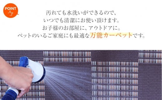 日本製(純国産)大木町にてパイプから織りまで行っています。ポリプロピレン素材を細いパイプ状にして織り込んだ敷物です。強度が高くしっかりとしています。汚れても水洗いができるので、いつでも清潔にお使い頂けます。お子様の部屋に、アウトドアに、ペットのいるご家庭に最適な万能カーペットです。