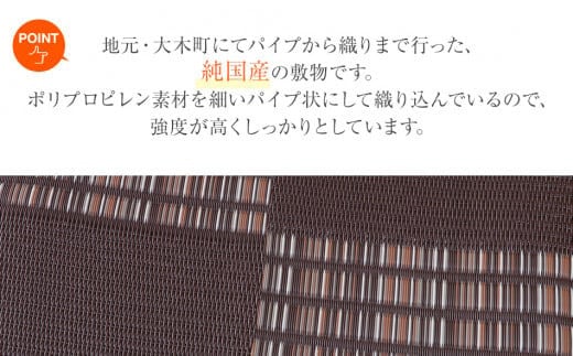 日本製(純国産)大木町にてパイプから織りまで行っています。ポリプロピレン素材を細いパイプ状にして織り込んだ敷物です。強度が高くしっかりとしています。汚れても水洗いができるので、いつでも清潔にお使い頂けます。お子様の部屋に、アウトドアに、ペットのいるご家庭に最適な万能カーペットです。