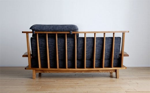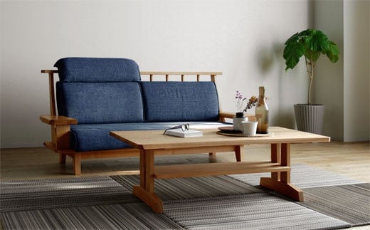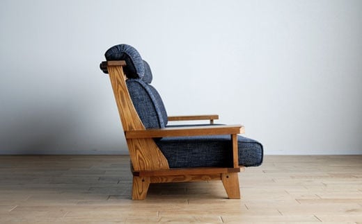 和の趣を感じる、重厚感たっぷりのデザインでありながら、ありがちな民芸調ではない、「イマに馴染む和」の雰囲気をまとわせました。全体的に低めの設定で、安心感とおちついた、どこか懐かしさも感じられるソファです。