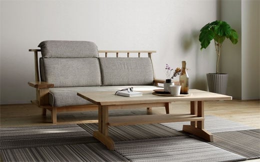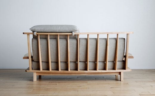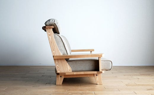 1本ずつ削りこまれた格子や、素材の重圧感あふれる肘。随所に和の趣を感じるソファ