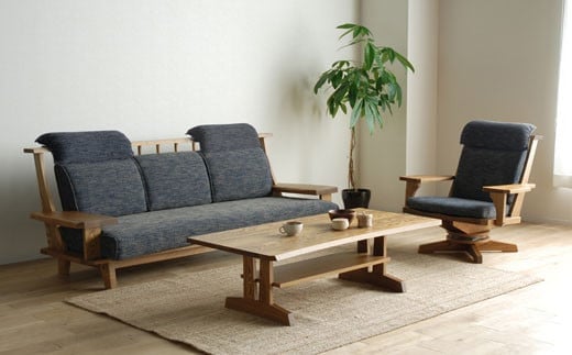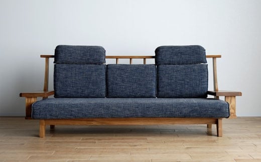1本ずつ削りこまれた格子や、素材の重圧感あふれる肘。随所に和の趣を感じるソファ