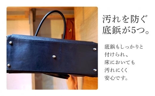 A4サイズが無理なく入り、前面の革切替え部分にはスマホなどの収納に便利なポケットを配置。移動中にもサッと取り出せます。