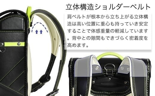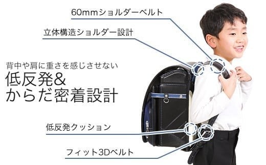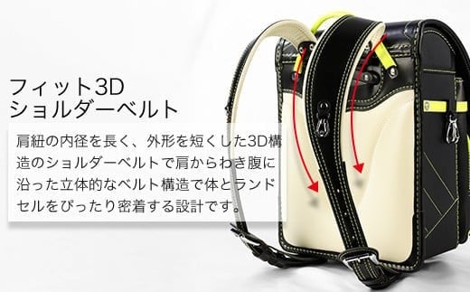 肩紐の内径を長く、外形を短くした3D構造のショルダーベルトは肩からわき腹に沿った立体的なベルト構造で体とランドセルをぴったり密着する姿勢サポート設計です。