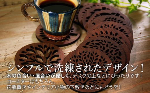 厚さ4.0mmのMDFを使用!レーザー加工によるきめ細かな葉っぱ柄のデザインの木製コースターです。