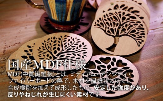 厚さ4.0mmのMDFを使用!レーザー加工によるきめ細かな葉っぱ柄のデザインの木製コースターです。