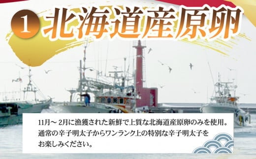 北海道産原卵を使用。きめ細やかな舌触りの程よい辛さの辛子明太子です。
