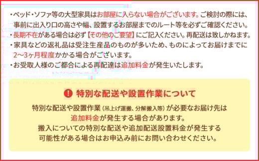 ・お届け時にご不在で再配達となった場合は、再配達料が必要となる可能性がございます。再配達料につきましては、お客様のご負担となりますこと予めご了承ください。