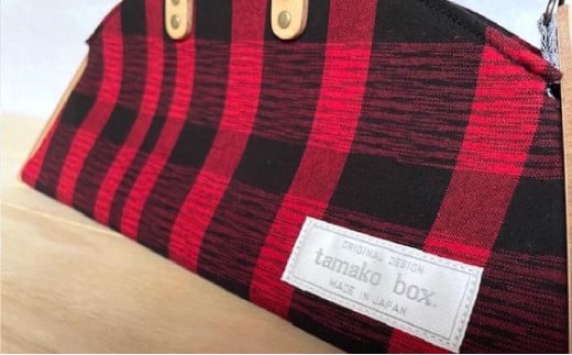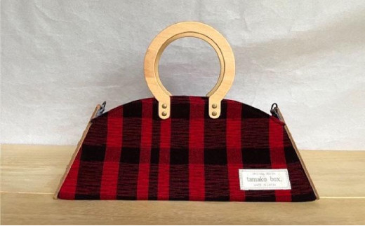 表生地は、赤・黑のチェック柄の久留米絣がシックで可愛くつかわれて います。また、ワンポイントにtamako boxのタグがついています。丸み をおびた開閉口は、ファスナーに赤い革紐が付いていて開け閉めしやす く、間口も広く開く構造になっています。裏地には、グレーの久留米絣 を使い内ポケットは、後ろに一つ付いています。このバッグの一番の特 徴であるのが、両サイドに三角屋根形と丸い持ち手の木材を加工して使 用していて、ひときは目をひく可愛いデザイン。 木と生地をカシメで留めることでクラシックな風合いも表現。驚くほど 軽い仕上がりのバッグ。中の容量もお財布、携帯、お化粧ポーチと十分 入るサイズです。ショルダーベルトも付いていて2wayスタイルで使用頂 けます。北欧スタイル、デザインを意識したハンドバッグでです。