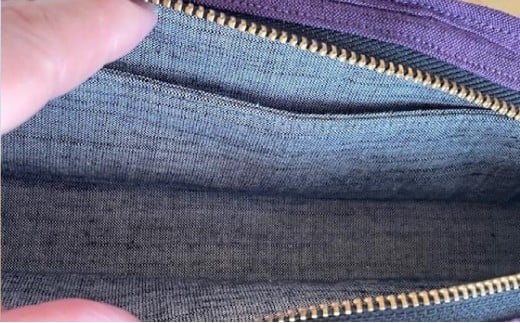 裏地には、グレーの久留⽶絣を使い内ポケットは、後ろに⼀つ付いています。