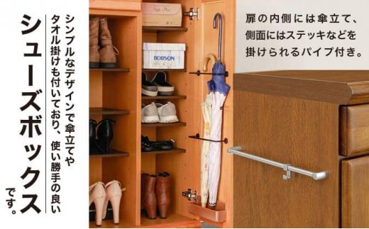シンプルなデザインで傘立てやタオル掛けも付いており使い勝手の良いシューズボックスです。