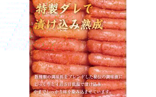 上質の一本物。特製ダレで漬込み熟成された自慢の明太子。ご贈答用に