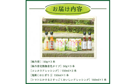 [柚乃香]ゆずごしょう:50g×3本、[柚乃香完熟無着色タイプ]ゆずごしょう50g×3本、[コレカラ]柚子胡椒和風ドレッシング:150ml×2本、[鬼斬(おにぎり)]赤唐辛子甘酢ソース:150ml×1本、[トマトにかけるとすっごくおいしいドレッシング]すりおろし柚子ドレッシング160ml×1本