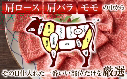 部位は【A4~A5】肩ロース・肩バラ・モモの中からその日に仕入れた一番いい部位を厳選してお届けいたします。しゃぶしゃぶすき焼きで食べることは勿論、地元ではシンプルに焼いて素材の味を堪能することも多いです。
