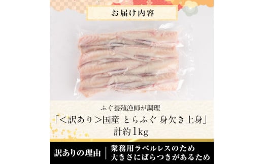 <訳あり・業務用>とらふぐ 身欠き上身 (計約1kg) 極みフグ 冷凍 ふぐ ふぐ鍋 焼ふぐ 唐揚げ てっちり鍋 お取り寄せ 鮮魚 養殖 国産 大分県 佐伯市【DK16】【(有)エイコー水産】