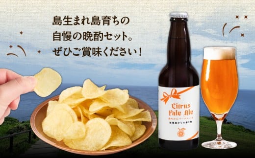 「島みかんペールエール」と「えらぶchips」の島生まれ島育ちの晩酌セット。