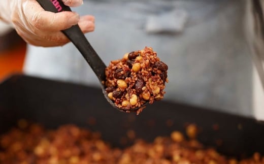 玄米、黒ゴマ、ハト麦で麹を作り、黒大豆、黄大豆にこの麹を加え、熟成・発酵させました。
