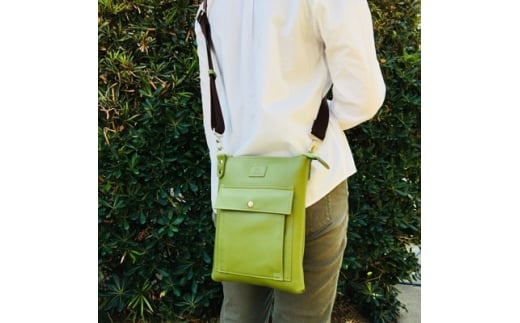 日本製 ショルダーバッグ グリーン (チャガマ) 牛革 薄型ショルダー ショルダー カバン 鞄 本革 天然皮革製品 縦型 小型 緑 カラー カジュアル プライベート オリジナル ブランド 肩掛け ギフト プレゼント 贈答 記念日 お祝い 送料無料 千葉県 旭 髙野縫製 ぬいざえもん メディア 千葉県 旭市