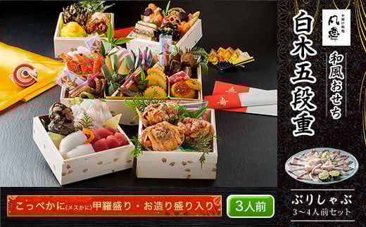 白木五段重 和風おせち こっぺかに(メスかに)甲羅盛り・お造り盛り入り(3人前) ぶりしゃぶ3~4人前セット ふるさと納税 正月 和風おせち こっぺかに(メスかに) 松葉かにの夫婦甲羅盛り入り 3人前 ぶりしゃぶ 3~4人前 セット 京都府 福知山市