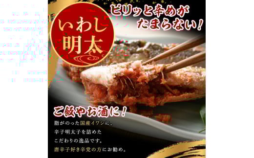 脂がのったイワシとサバに辛子明太子をはさみました。アツアツご飯・お酒のお供に。