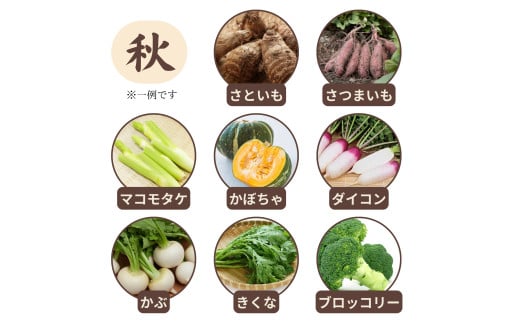 さといも、さつまいも、まこもたけ、ブロッコリー、ほうれんそう、しゅんぎく、こまつな、かぶ、ダイコン、らっかせい