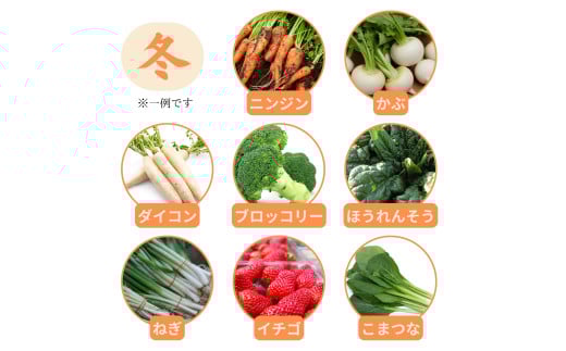 イチゴ、ブロッコリー、ほうれんそう、しゅんぎく、こまつな、かぶ、ダイコン、ニンジン、ラディッシュ