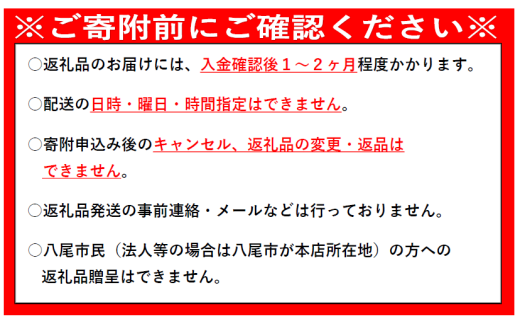 決済完了後、商品等のお届けまでは1~2ケ月程度かかります。日時指定等は対応できませんので予めご了承ください。