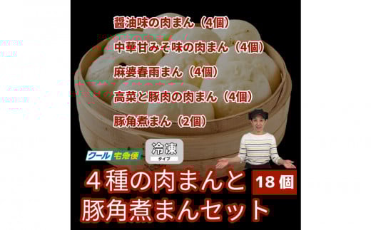 当店人気の4種類の肉まんと豚角煮まん、計18個をお届けします。
