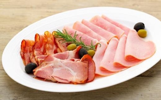 ロースハムスライス100g、焼豚スライス70g、ポークハムスライス120g、ベーコンスライス60g、パストラスライス90g、ヨーデルウインナー(3本)65g、ポークソーセージウインナー(3本)65g