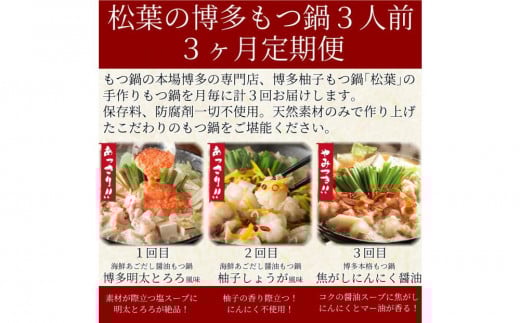 松葉の本格もつ鍋「博多もつ鍋3種の味食べ比べ!3ヶ月定期便」2人前~3人前【海鮮あごだし醤油(明太とろろ風味)・海鮮あごだし醤油(柚子しょうが風味)・焦がしにんにく醤油】