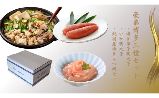 豪華博多三種セット(博多辛子明太子・いか明太子・純国産博多もつ鍋(醤油味))