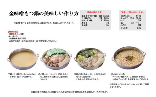 国産牛もつ(小腸)200g、もつ鍋だし(340g)、ちゃんぽん麺(180g)、唐辛子(3g)、金胡麻(3g)