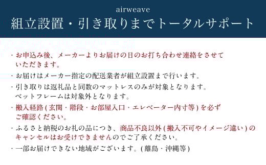 ※配送の日程、商品の引き取り有無を含む返礼品のお届けの詳細につきましては、入金確認後に寄附者様と返礼品提供事業者(エアウィーヴ)の担当者で直接お打ち合わせとなります。