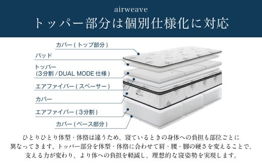 トッパー部分は個々人の体形に合った硬さパターンに変えることができる、カスタマイズ可能なベッドマットレスです。