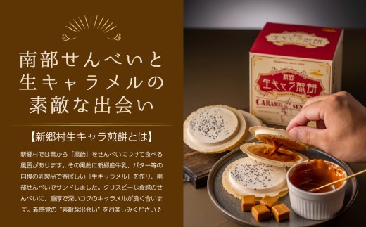 【新郷村生キャラ煎餅とは】新郷村では昔から「黒飴」をせんべいにつけて食べる風習があります。その黒飴に新郷産牛乳、バター等の自慢の乳製品で香ばしい「生キャラメル」を作り、南部せんべいでサンドしたのが本品です。クリスピーな食感のせんべいに、重厚で深いコクのキャラメルが良く合う製品です。 【伝統の南部煎餅を改良・サクサク食感を実現】南部せんべいは、うるち米で製造されるせんべいと違い原料は小麦粉で出来ています。小麦粉だけで出来たせんべいは、固い食感のせんべいになります。これはこれで美味しいのですが少し固過ぎてしまい、食べ難い方も出てしまいます。そこで、試行錯誤を重ね小麦粉に重曹を加えることで、これまでにないサクサクの食感を実現しました。 【ピュアな素材から生まれる生キャラメルの深いこく】生キャラメルの原料は新郷村間木の平(まぎのたい)の生乳、生クリーム、新郷黒飴、砂糖、バターのみ。材料は非常にシンプルですが、シンプルが故に手間が掛かかります。添加物等に頼らずじっくり作る事でコクがあって口の中で、不思議なくらいス~って溶けていくキャラメルが出来上がります。このままで食べて頂くのが一番美味しいのですが、電子レンジで温める事で生キャラメルが溶けて別の食感もお楽しみいただけます。 【原料へのこだわり・牧草作りからこだわった生乳のみ使用】主原料となる生乳は専約畜産家1件という強いこだわり。青森の広大な大地で栄養満点の牧草と非遺伝子組み換え飼料で飼育された、ストレスないリラックスした最高の環境で生活している牛から搾った生乳を100パーセント使用しています。