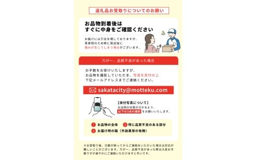 [備考] ■返礼品について 入金確認後に発注いたしますので、到着までに30日ほどお時間をいただきます。そのため12月は、年内のお届けが困難な場合があります。定期便など提供時期が決まっているものはその時期に発送します。 【品物発送に関する問合せ】 平野新聞舗「Motteku事業部」フリーダイヤル 0120-39-0251 ■受領書について 品物とは別に普通郵便で送付します。寄附日から2~3週間程度お時間をいただきますが、30日経っても届かない場合は、酒田市ふるさと納税担当までご連絡ください。 ■ワンストップ特例申請について 12月下旬にご入金いただいた方には、酒田市からワンストップ特例申請書の様式を郵送しません。ご自身で様式をダウンロードいただき、翌年1月10日(必着)まで送付ください。申請期限を過ぎますと、ワンストップ特例が適用できませんのでご注意ください。 ※送付先:〒998-0044 山形県酒田市中町一丁目4-10 酒田市ふるさと納税担当あて ※マイナンバーカードをお持ちの方は、「自治体マイページ」(https://mypg.jp/)からのオンライン申請がお勧めです。